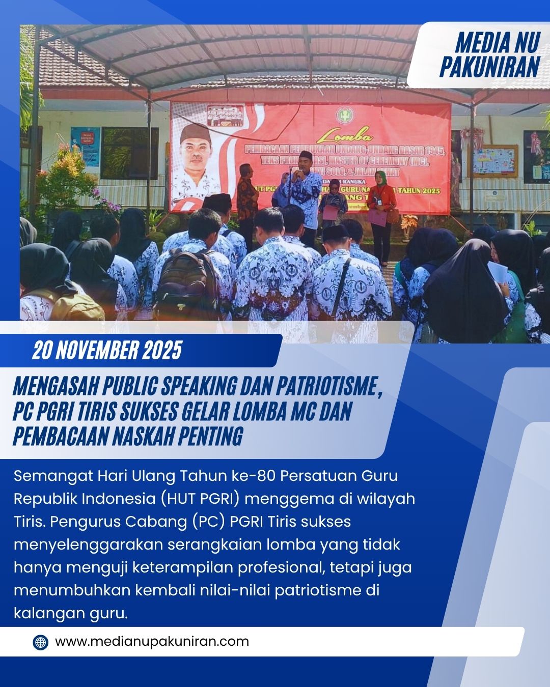 Media NU Pakuniran,TIRIS, 20 November 2025 – Pengurus Cabang (PC) PGRI Tiris sukses menggelar serangkaian lomba dalam rangka memperingati Hari Ulang Tahun (HUT) PGRI ke-80. Bertema “Mengasah Public Speaking dan Patriotisme,” acara ini bertujuan untuk meningkatkan kompetensi guru sekaligus memperkokoh semangat kebangsaan. Kegiatan dipusatkan di Sekretariat PC PGRI Tiris, SDN Pesawahan, berlangsung meriah dan penuh makna.