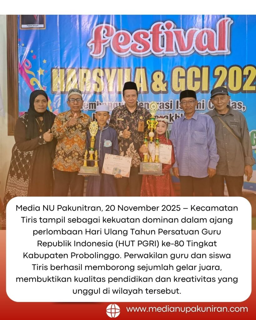 Media NU Pakunitran, 20 November 2025 – Kecamatan Tiris tampil sebagai kekuatan dominan dalam ajang perlombaan Hari Ulang Tahun Persatuan Guru Republik Indonesia (HUT PGRI) ke-80 Tingkat Kabupaten Probolinggo. Perwakilan guru dan siswa Tiris berhasil memborong sejumlah gelar juara, membuktikan kualitas pendidikan dan kreativitas yang unggul di wilayah tersebut.