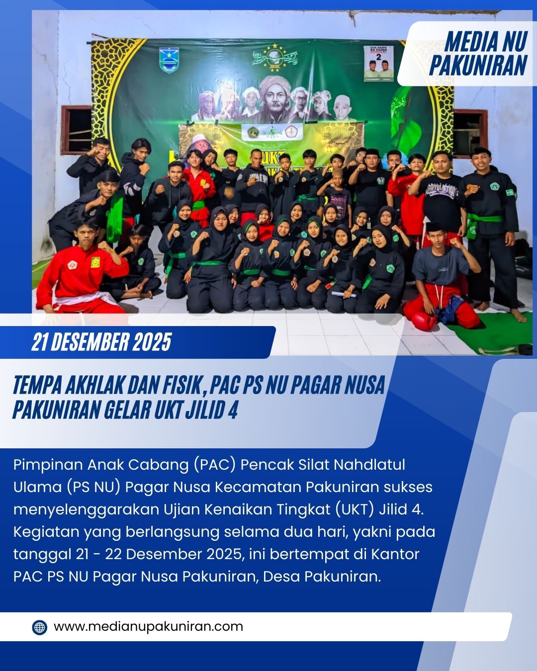 Medianupakuniran.com, Minggu, 21 Desember 2025, – Pimpinan Anak Cabang (PAC) Pencak Silat Nahdlatul Ulama (PS NU) Pagar Nusa Kecamatan Pakuniran sukses menyelenggarakan Ujian Kenaikan Tingkat (UKT) Jilid 4. Kegiatan yang berlangsung selama dua hari, yakni pada tanggal 20 – 21 Desember 2025, ini bertempat di Kantor PAC PS NU Pagar Nusa Pakuniran, Desa Pakuniran.