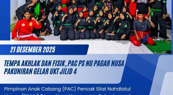 Medianupakuniran.com, Minggu, 21 Desember 2025, – Pimpinan Anak Cabang (PAC) Pencak Silat Nahdlatul Ulama (PS NU) Pagar Nusa Kecamatan Pakuniran sukses menyelenggarakan Ujian Kenaikan Tingkat (UKT) Jilid 4. Kegiatan yang berlangsung selama dua hari, yakni pada tanggal 20 – 21 Desember 2025, ini bertempat di Kantor PAC PS NU Pagar Nusa Pakuniran, Desa Pakuniran. UKT … Lanjutkan membaca Tempa Akhlak dan Fisik, PAC PS NU Pagar Nusa Pakuniran Gelar UKT Jilid 4