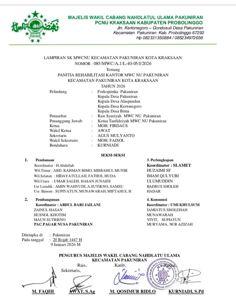Dalam momentum tersebut, MWC NU Pakuniran juga mengambil langkah strategis dengan menerbitkan Surat Keputusan (SK) Kepanitiaan Rehab Pembangunan Kantor MWC NU Pakuniran, menyusul masih mangkraknya proses pembangunan kantor.