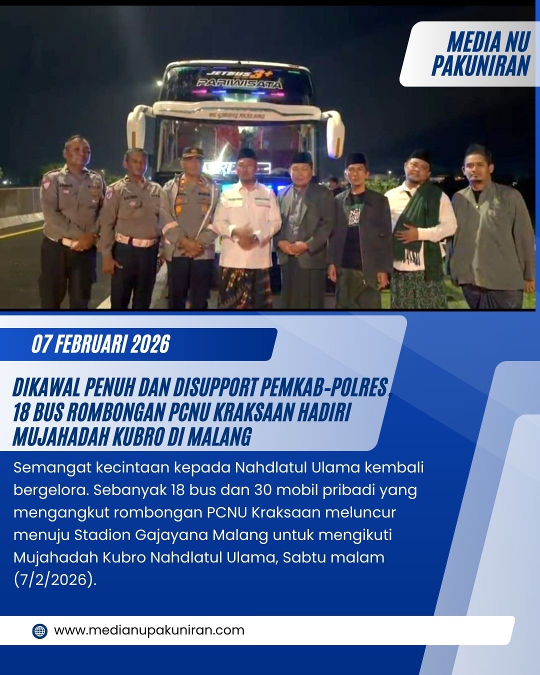 Kraksaan,medianupakuniran.com – Semangat kecintaan kepada Nahdlatul Ulama kembali bergelora. Sebanyak 18 bus dan 30 mobil pribadi yang mengangkut rombongan PCNU Kraksaan meluncur menuju Stadion Gajayana Malang untuk mengikuti Mujahadah Kubro Nahdlatul Ulama, Sabtu malam (7/2/2026).