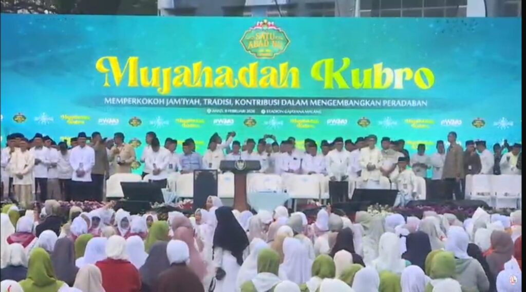 Malang, medianupakuniran.com – Lautan warga Nahdliyyin dari berbagai penjuru Jawa Timur memadati Stadion Gajayana Malang dalam gelaran Mujahadah Kubro Satu Abad Nahdlatul Ulama. Gelombang doa, dzikir, dan shalawat yang menggema menjadi peneguh eksistensi NU dalam merawat jagad, menjaga tradisi, serta memperkokoh persatuan dan kesatuan Negara Kesatuan Republik Indonesia.
